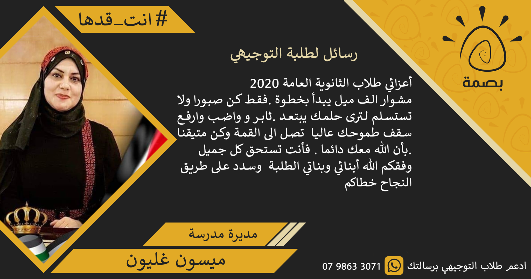 قامت منصة بصمة للتعليم والتنمية بإطلاق مبادرة إنت قدها لتقديم الدعم النفسي لطلبة الثانوية العامة من خلال نشر رسائل الدعم المجتمعية من كافة أطياف المجتمع من ( طلبة ، معلمين ، اولياء أمور .. وغيرهم ) لبث روح التفاؤل وشحذ الهمم لدى الطلبة حيث شارك في هذه المبادرة أكثر من (500) متطوع